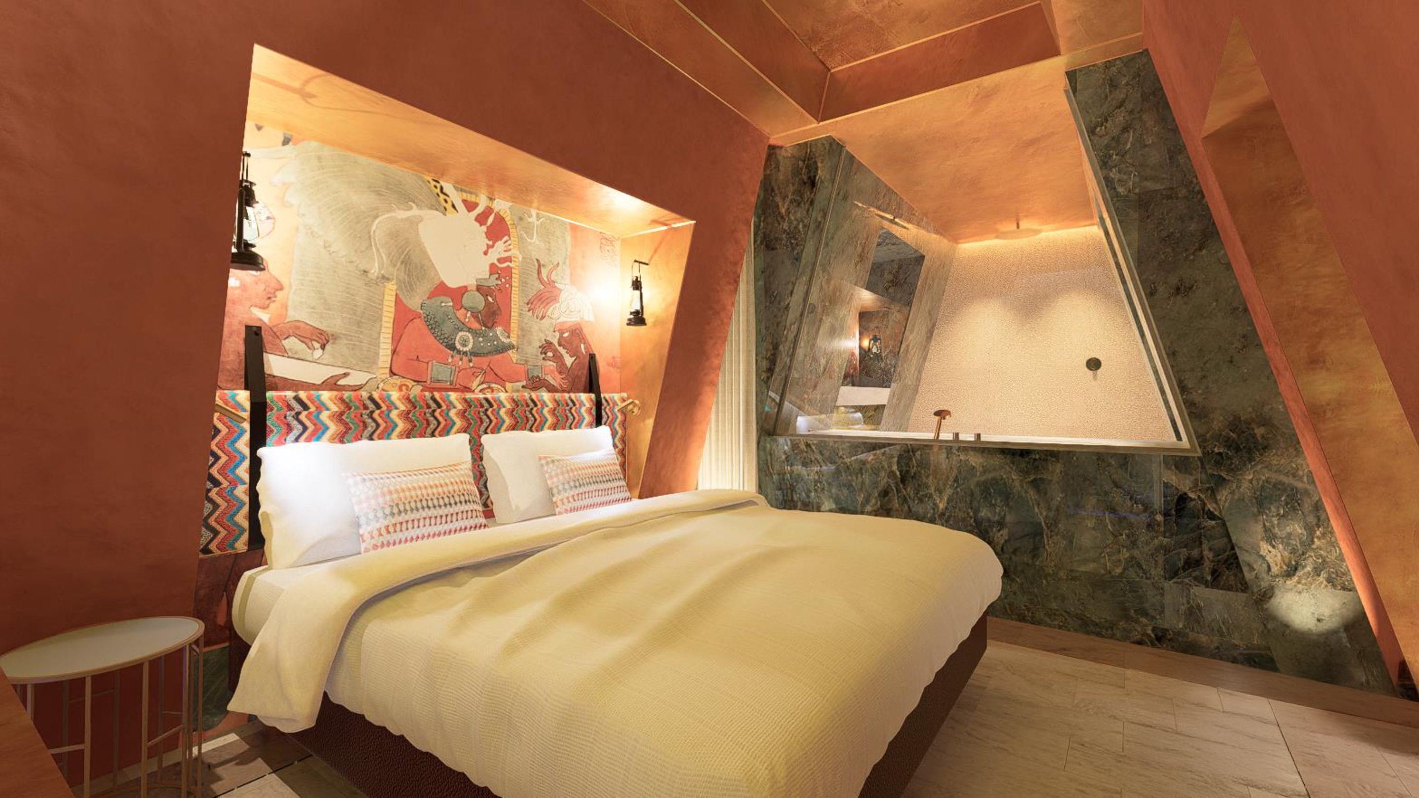 Inspirée des temples mayas, la chambre associe pierre chaude, voûtes protectrices et lumière dorée.